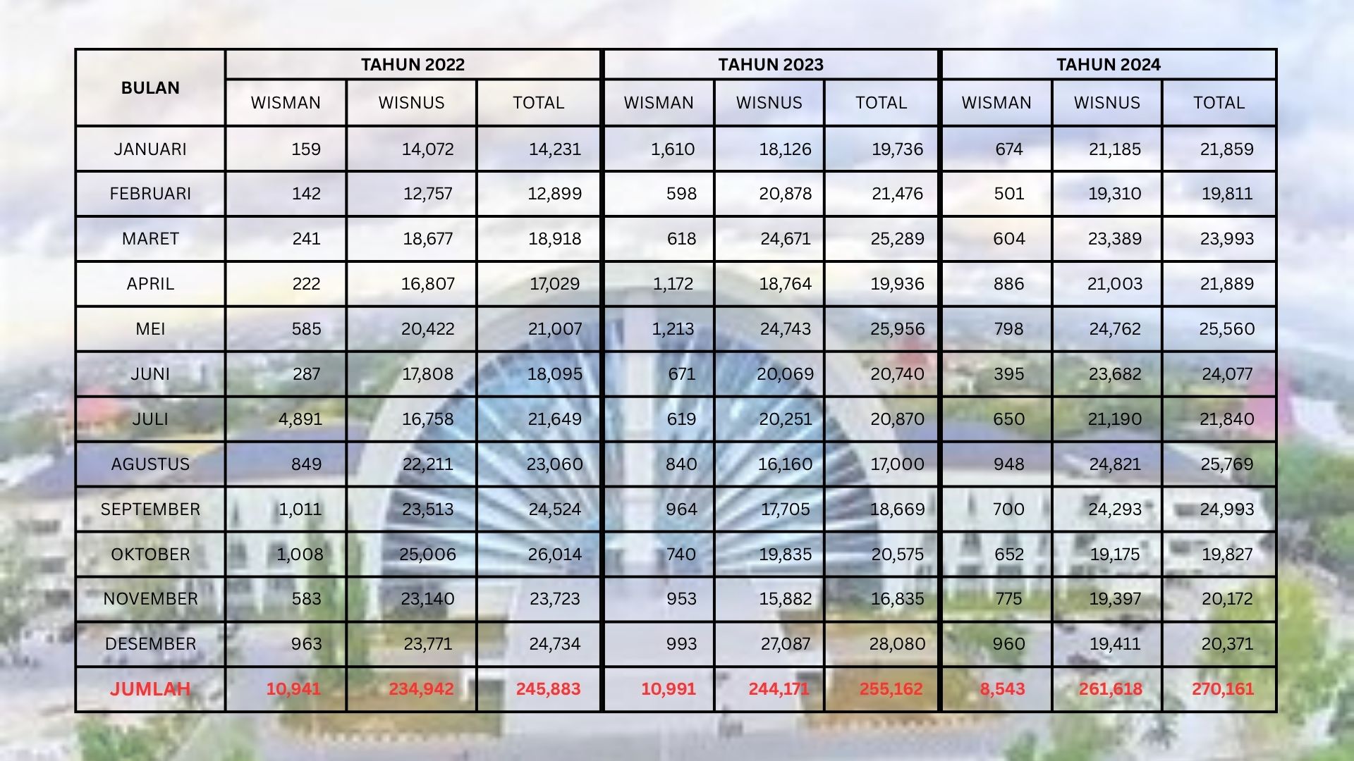 Rincian Jumlah Wisatawan Setiap Bulan dari tahun 2022 hingga 2024