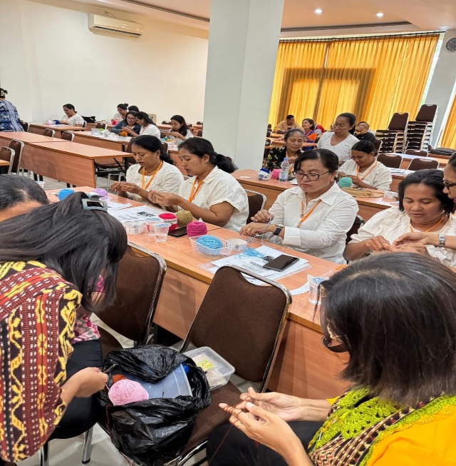 2. Kombinasi tenun dan rajut. Dalam pelatihan ini, peserta diperkenalkan pada teknik menggabungkan kain tenun NTT dengan kreasi rajutan modern.