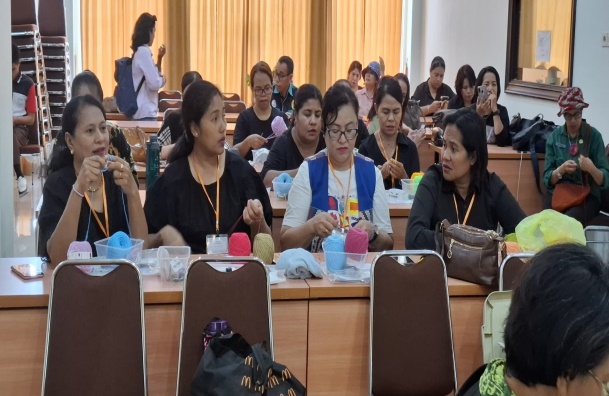 Pembawa Materi Ibu Mely Tobin mempraktekkan cara membuat rajutan gelang.